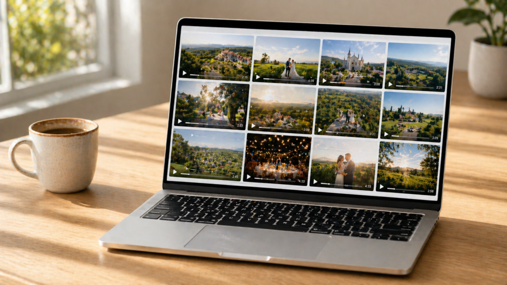 Coerência entre drone e câmera convencional. Se o videógrafo inclui drone no pacote, ver se as imagens aéreas têm a mesma paleta de cores e o mesmo estilo de edição das imagens convencionais. Quando parecem produzidas por profissionais diferentes sem alinhamento, é exatamente o que aconteceu.