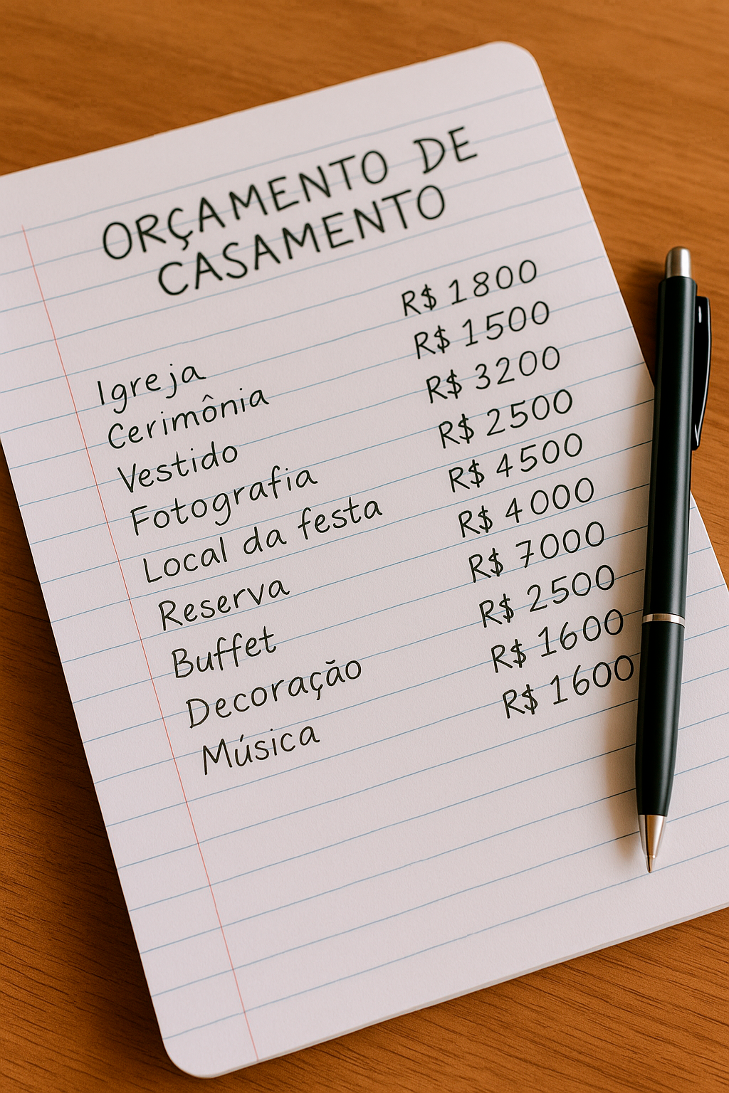 - Divida o orçamento por categorias (local, buffet, vestido, etc.).