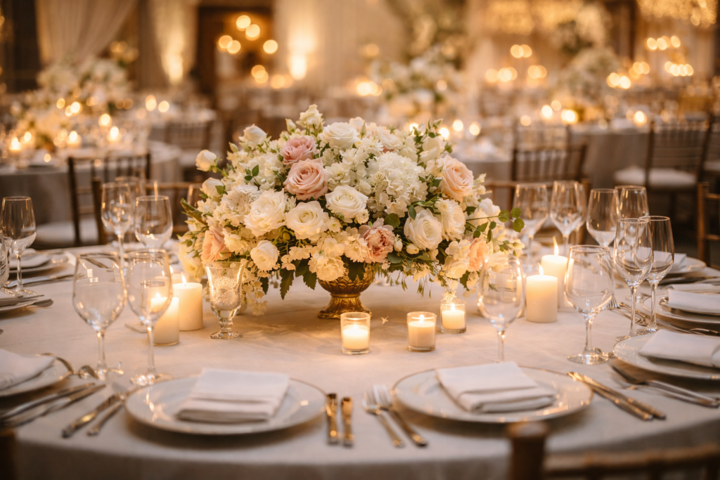 Flores e decoração são itens que os casais frequentemente subestimam. Uma decoração média para 150 pessoas pode facilmente ultrapassar R$ 15.000.